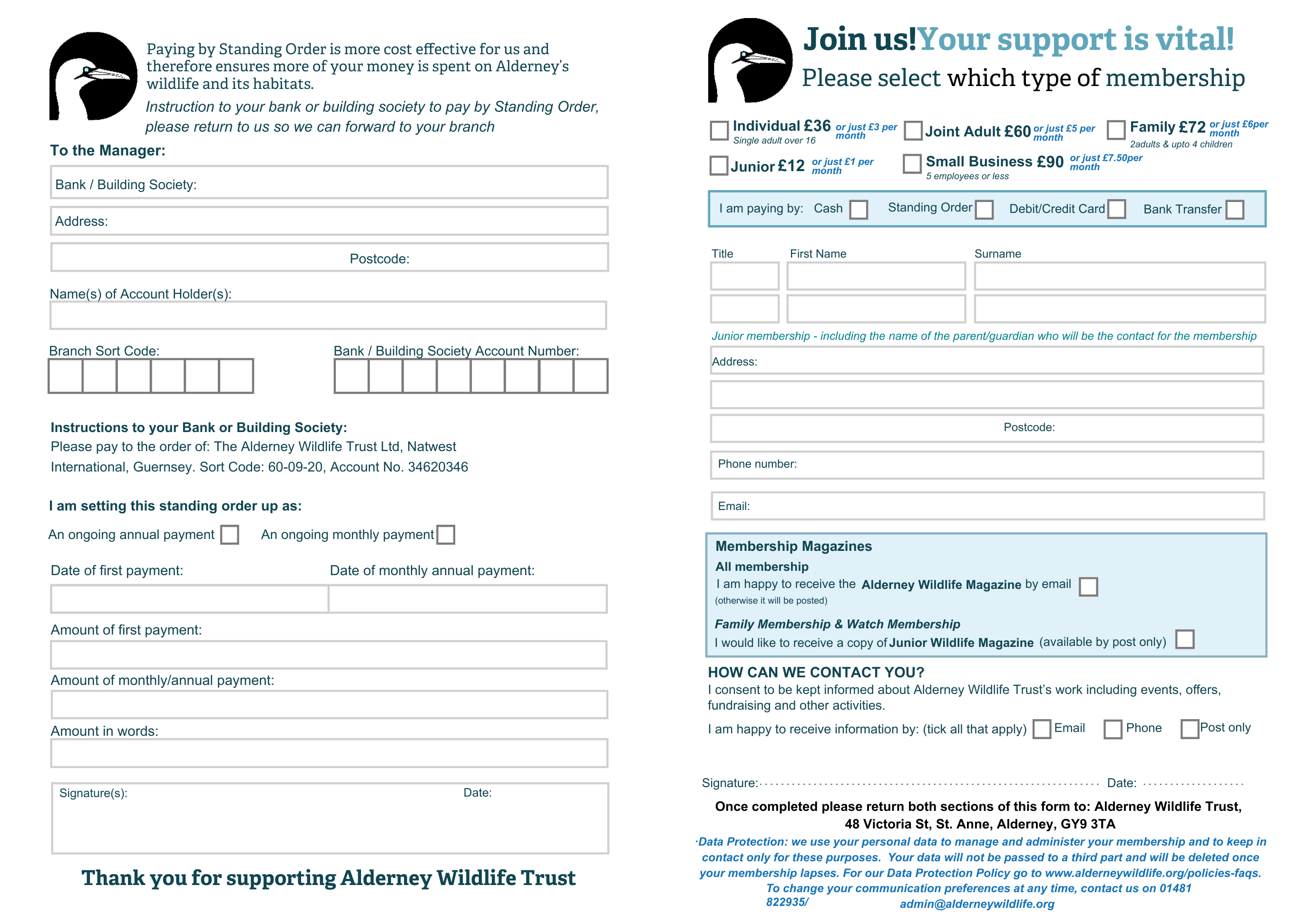 If you would like to make a recurring payment please fill in our standing order form, or contact us at admin@alderneywildlife.org and we can provide you with an online subscription form.