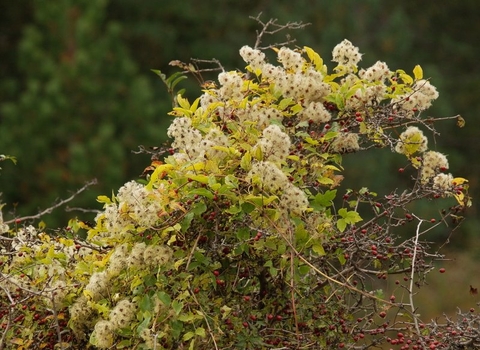 Traveller's-joy is a climbing plant that scrabbles over bushes in hedgerows, woodland rides and edges, and scrubby grassland on limestone soils. This wild clematis produces a mass of scented, white flowers in late summer and is pollinated by bees and hoverflies. The seeds are also eaten by many birds, such as goldfinches and greenfinches.